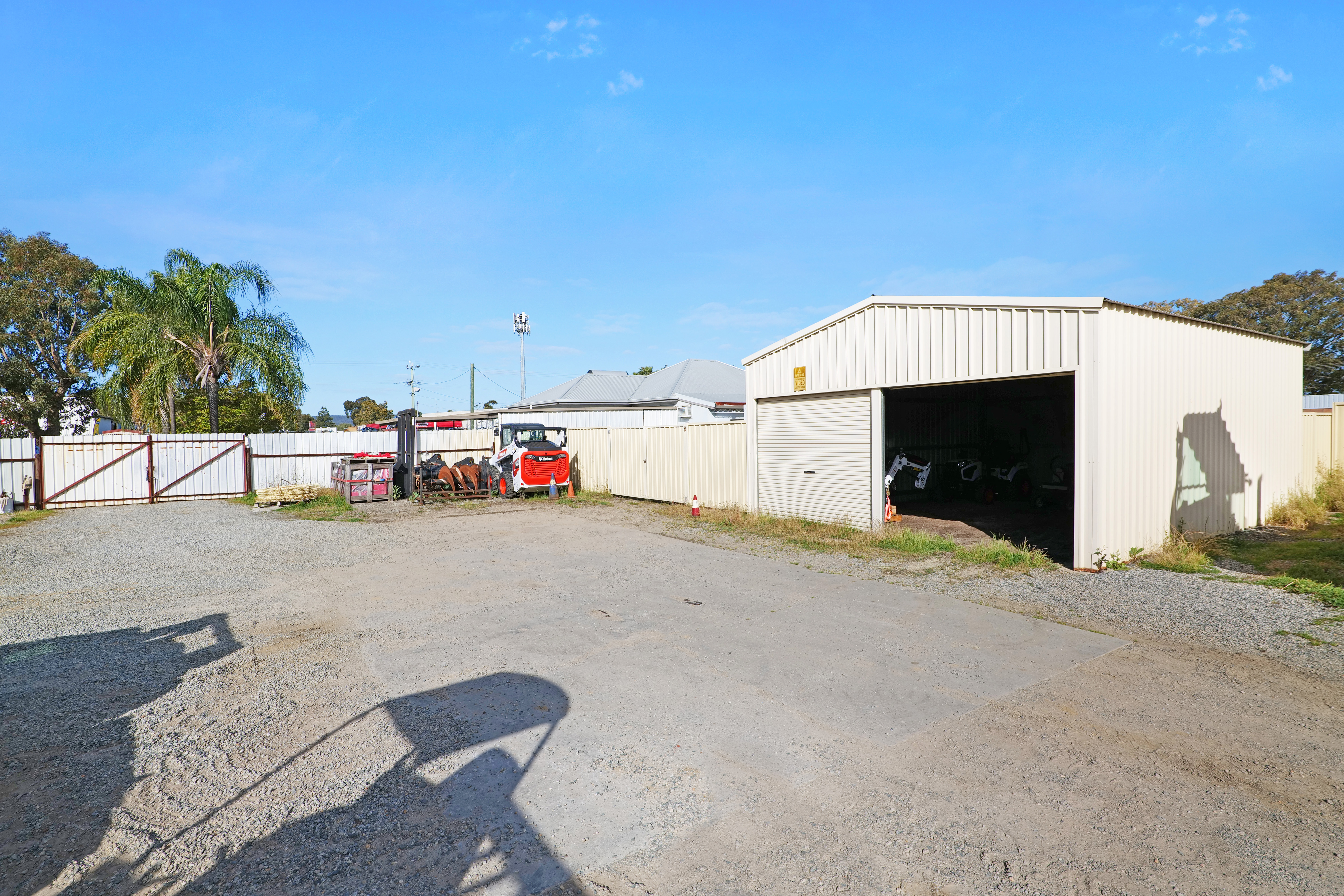 The workshop is built of brick elevations, iron roof and concrete floors and footing. It sits on the boundary of the southern periphery of the site and is open at the front which allows for access of larger vehicles. Contained within are two small offices plus a mezzanine above for extra storage.