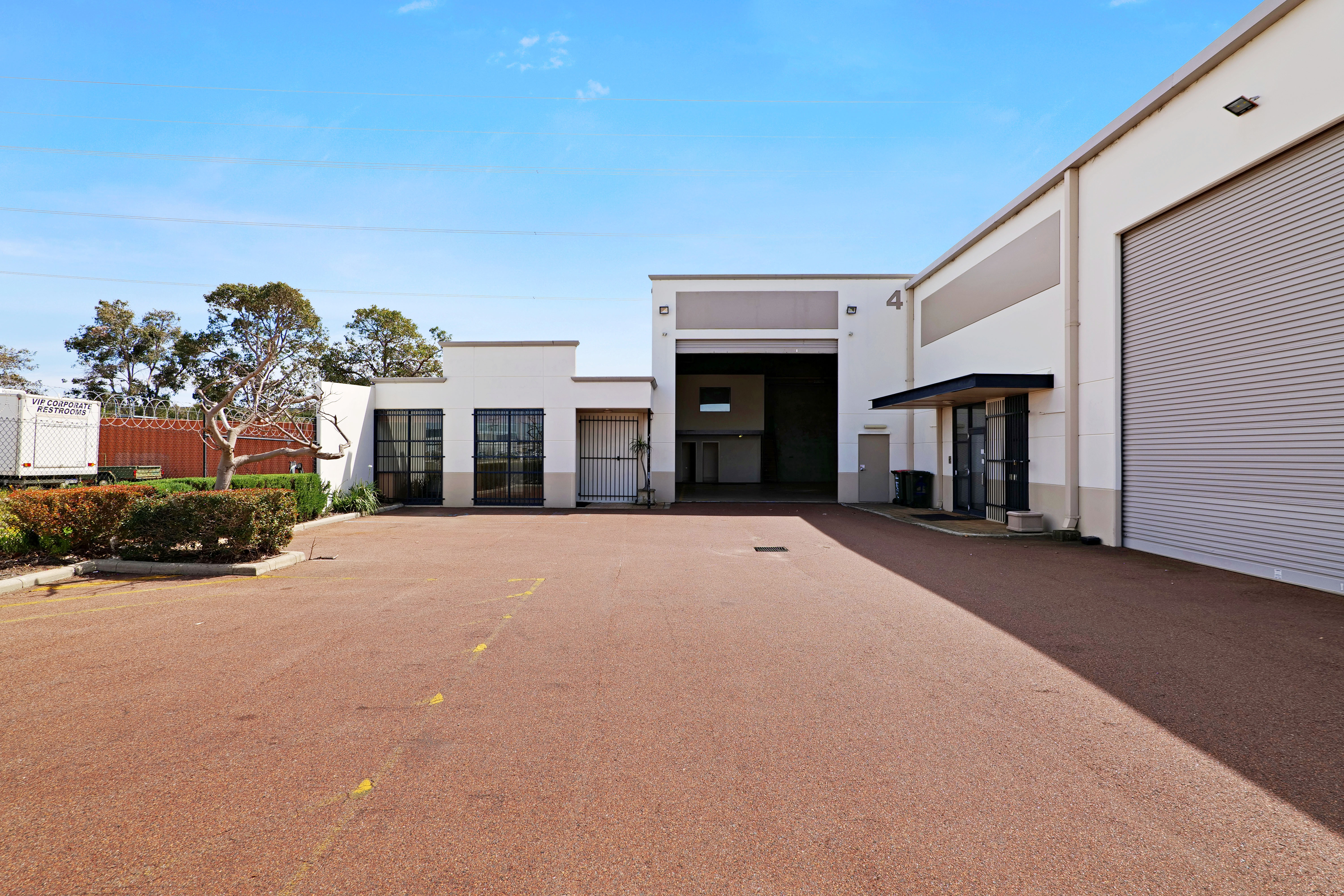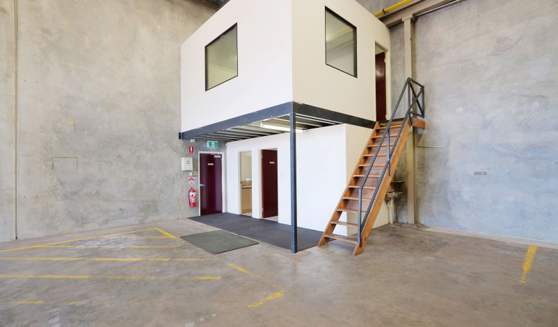 The warehouse includes concrete floors, concrete walls and an iron roof. Access to the warehouse is from the front elevation via a large roller door. The warehouse area has a truss height of approximately 7 meters, clear span, and is in excellent condition. The warehouse also features a mezzanine for additional storage capabilities.